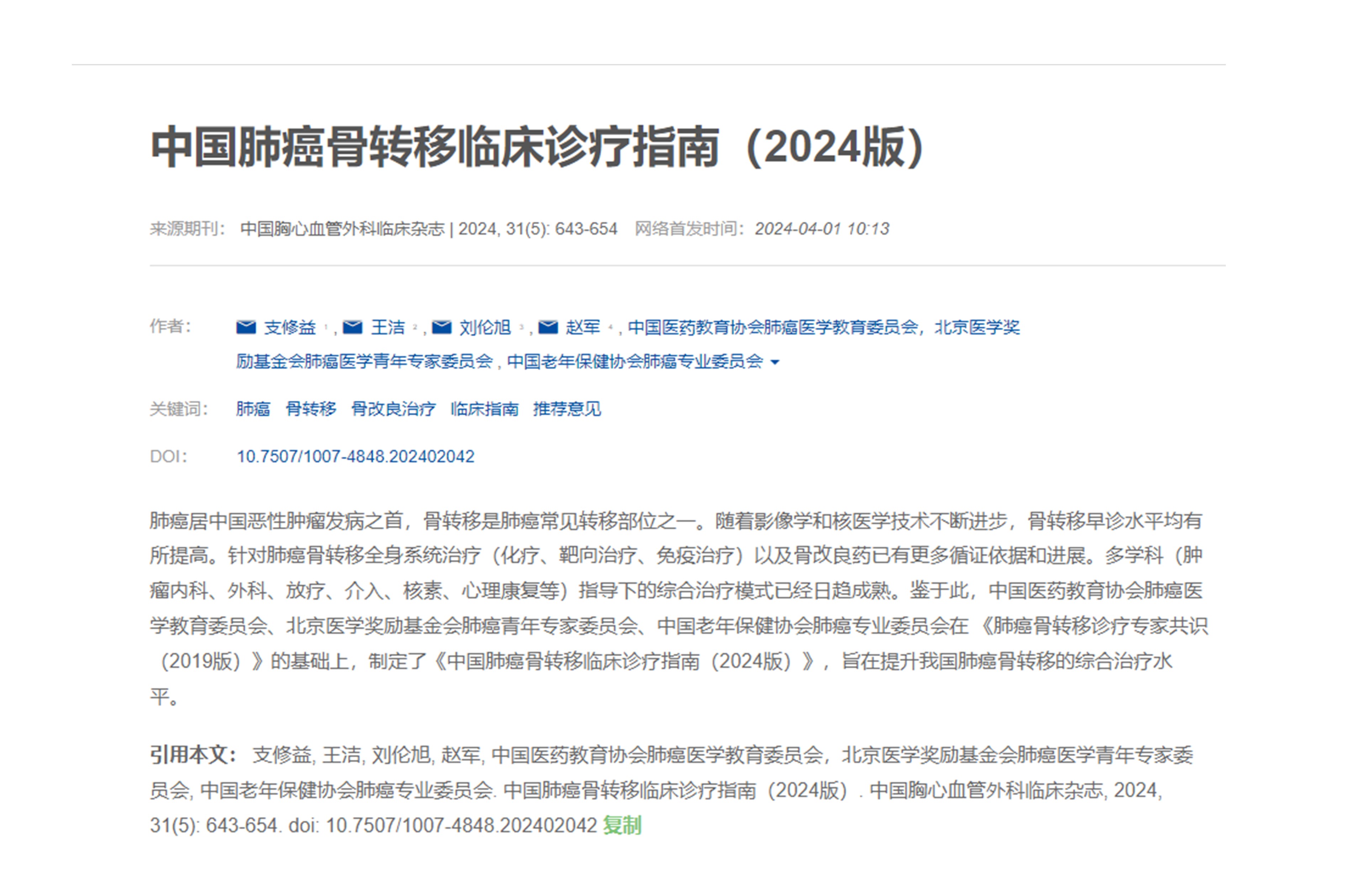 在《肺癌骨轉(zhuǎn)移診療專家共識(shí)(2019版)》的基礎(chǔ)上,制定了《中國(guó)肺癌骨轉(zhuǎn)移臨床診療指南(2024版)》,旨在提升我國(guó)肺癌骨轉(zhuǎn)移的綜合治療水平。