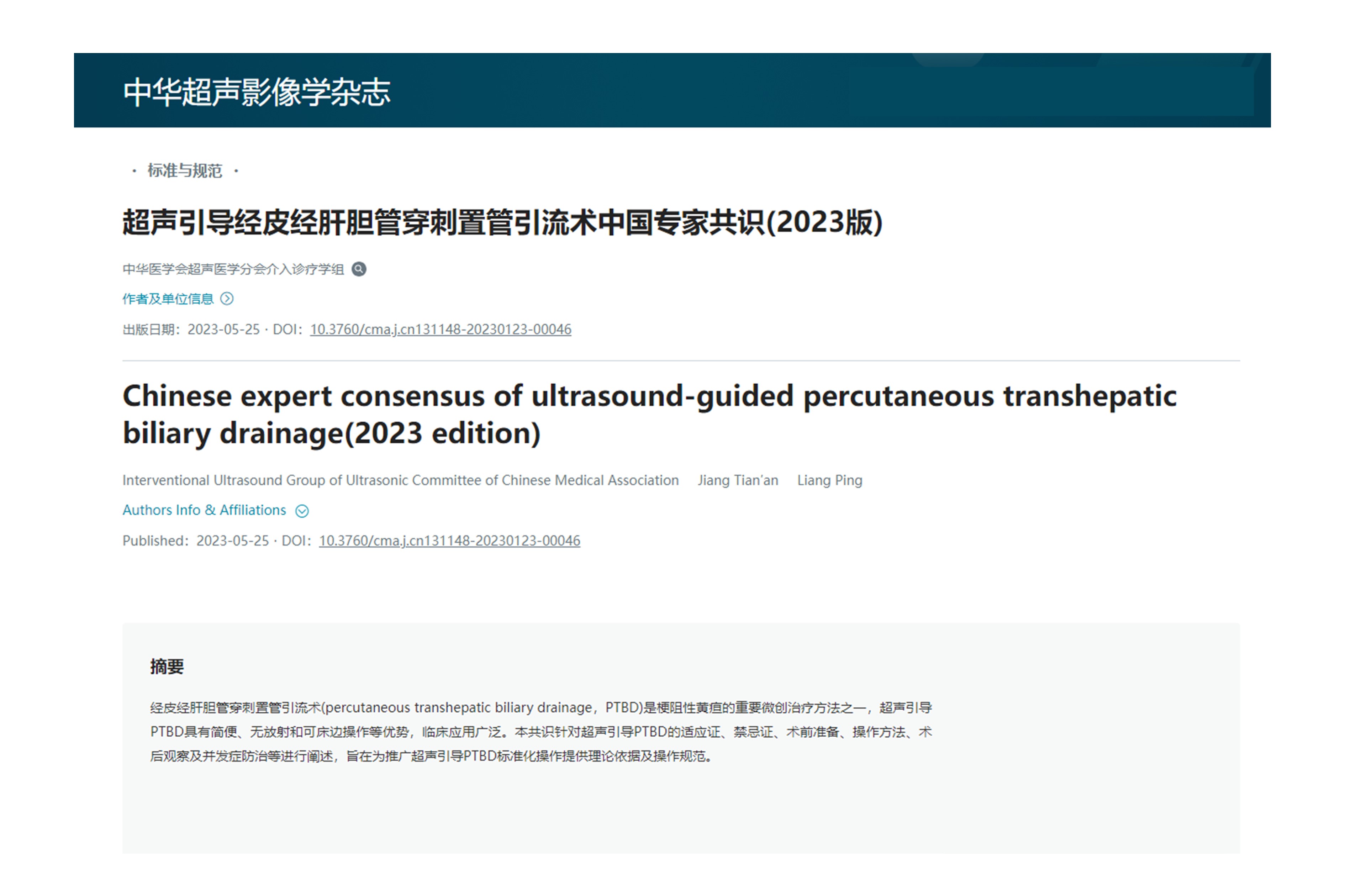 本共識(shí)針對(duì)超聲引導(dǎo)PTBD的適應(yīng)證、禁忌證、術(shù)前準(zhǔn)備、操作方法、術(shù)后觀察及并發(fā)癥防治等進(jìn)行闡述,旨在為推廣超聲引導(dǎo)PTBD標(biāo)準(zhǔn)化操作提供理論依據(jù)及操作規(guī)范。