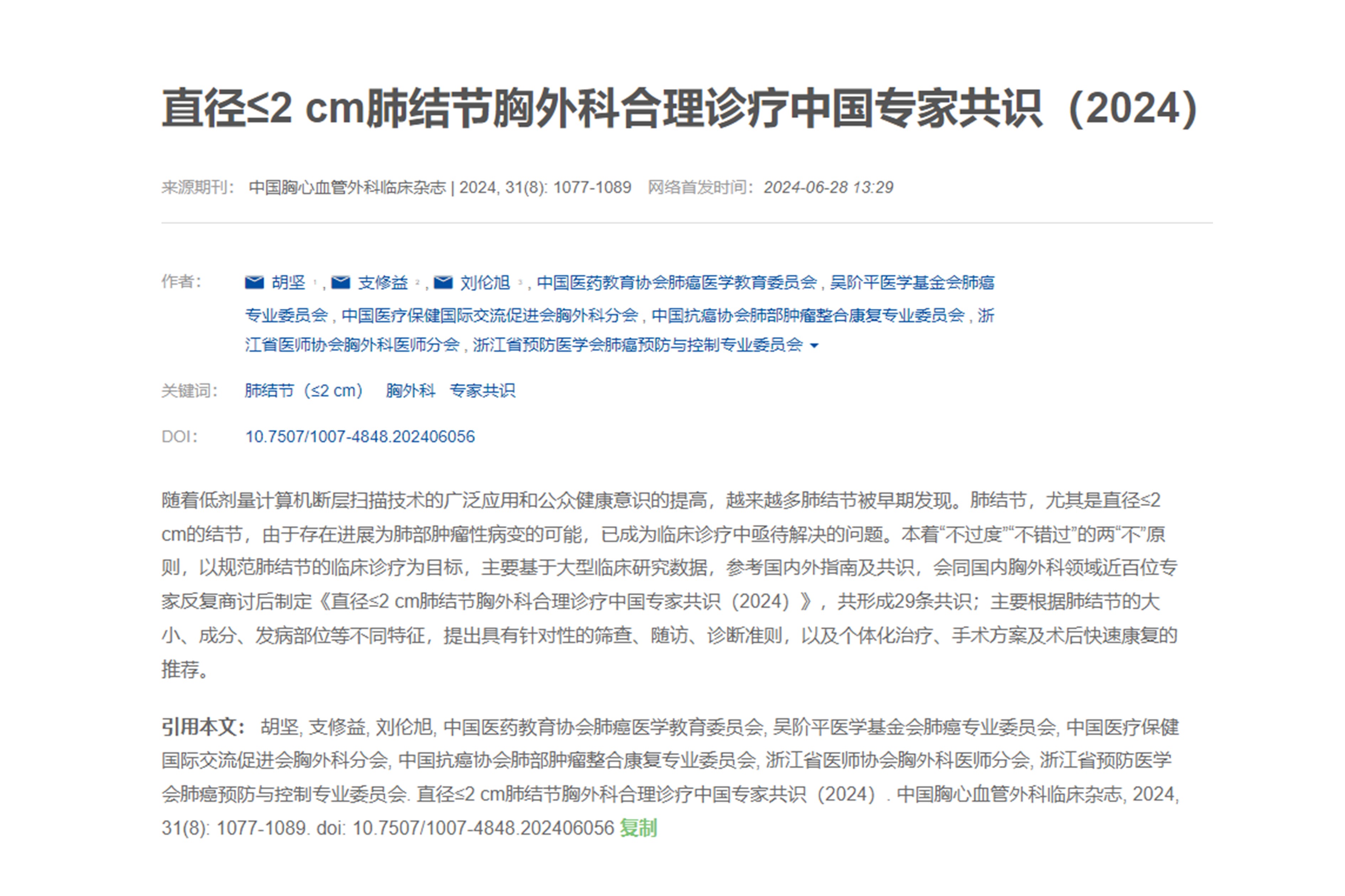 根據(jù)近年來中國(guó)肺癌防治聯(lián)盟肺結(jié)節(jié)診治分中心的推廣經(jīng)驗(yàn),更新現(xiàn)有的文獻(xiàn)證據(jù),對(duì)該共識(shí)進(jìn)行第三次修訂和更新,形成了《肺結(jié)節(jié)診治中國(guó)專家共識(shí)(2024年版)》